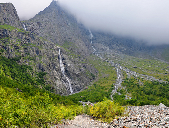 Далее мы переедем в жемчужину Кармадонского ущелья – каскад Мидаграбинских водопадов, которые берут свое начало на километровой высоте ледника Мидаграбин и каскадом водных потоков низвергаются вниз.